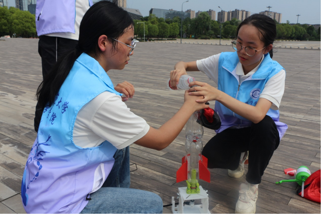 华龙网-新重庆客户端讯 近日,bat365官方官网化学学院“启”航璧山·逐“蒙”未来实践团与璧山区大岚社区携手合作,校地共建公益“社区暑期托管班”。7月6日,实践团设计“童心向太空,火箭携梦想”水火箭科普体验课,带小朋友们在实践中增知识、长才干,结合生活实际,探索科学奥秘。