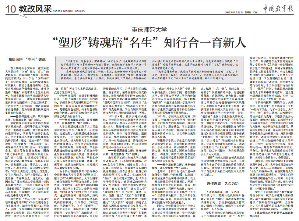 同时,学校持续优化学生评价方式,通过修订奖学金评定规则,助力完善优良学风深培机制,学生学风持续向好。学生资助中心坚持助困、扶志、赋能“三位一体”,持续完善“三春暖学”发展型资助体系,构建起物质帮助、道德浸润、能力拓展、精神激励有效融合的资助育人长效机制,着力培养学生的创新精神和实践能力。生物科学专业毕业生丁奕然,曾获得第十届中国大学生年度人物、重庆市第四届大学生创业大赛一等奖、“创青春”全国大学生创业大赛铜奖、重庆青年创新创业大赛一等奖等荣誉,多篇论文被CSSCI、CSCD等检索系统收录。学校心理健康教育与咨询中心精心打造的心理情景剧《麻花进化论》在全国心理情景剧大赛中荣获“十佳剧目”和“最佳导演”奖。大学生“云上村官”科技振兴乡村服务团,立足科技创新和实践育人,遴选大学生担任“云上村官”,开展电商服务等,助力乡村振兴,为当地群众带去上百万元收益。