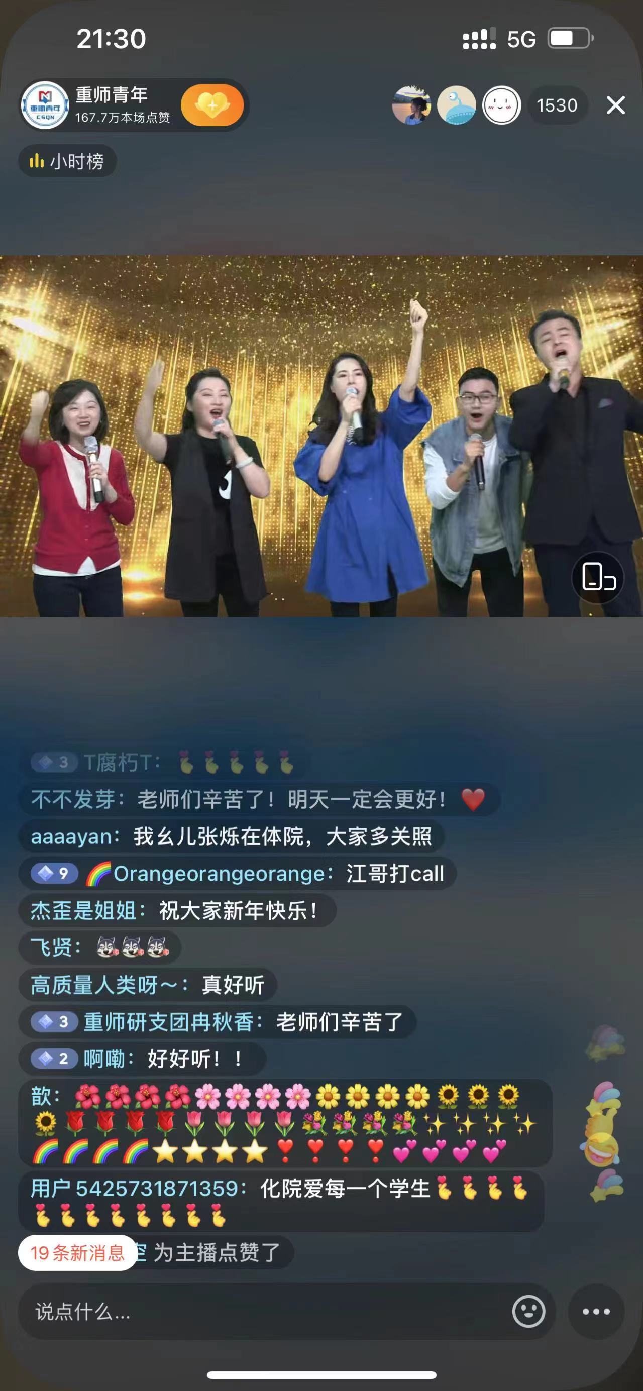 直播现场,工作时长超29年的“柏爸爸”柏仕坤、新进“学工男神”胡绍宇、“清新女神”曾珠等23名一线学工教师代表为同学们带来原创曲目、师生合唱、民族舞蹈等节目,不少同学表示“节目太赞了,给疫情生活增添了不少色彩!”“为老师们打call!”