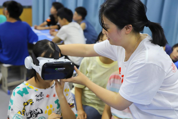 团队成员通过开展《艺术与思政》——沉浸式VR体验活动,为学生们讲解VR技术的开发与应用,加深同学们对虚拟现实的理解,并带领同学们亲身参与到沉浸式VR体验活动中,与同学们一同体验不一样的虚拟旅行。“360度旋转实景展示,720度无死角漫游”。在体验课上,教师志愿者们耐心指导同学们VR眼镜的使用方法,帮助同学们调整眼镜的位置、焦距,学生们通过VR设备的背景音乐和虚拟场景,逐个体验了凤凰古城、在外星球坐过山车等场景。