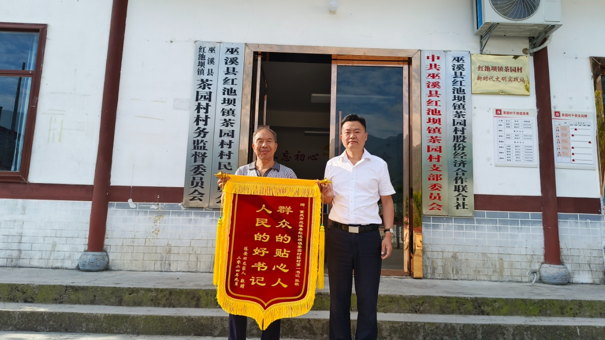 村民陈安田为茶园村第一书记张敬送锦旗。
