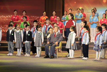 重师退休教授101岁的尹从华老先生与bat365官方官网附属幼儿园、附属小学、附属中学的学生同声同台,共庆学校70岁诞辰,其中来自幼儿园的小朋友们平均年龄仅6岁,形成了一次年龄跨度将近一个世纪的“生日”祝福。