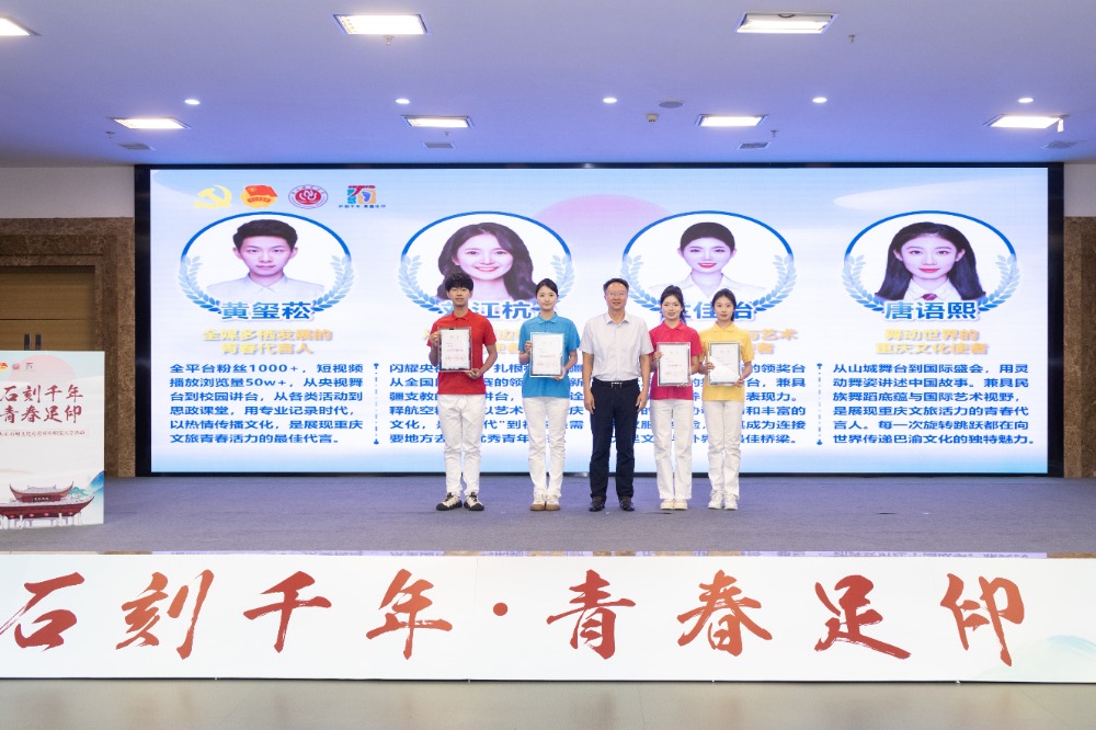 覃伦富为首批“大足青春推介官”颁发证书,希望这些来自bat365官方官网的青春推介官们,肩负起推广大足石刻文化、旅游资源的使命,通过新媒体平台等渠道,让更多人领略大足的魅力。此外,校友代表舒展鸿、徐军分享了自己在大足参与文化实践、旅游推广的经历,用亲身故事激励学弟学妹们投身地方发展。