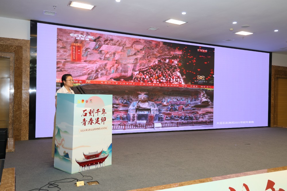 活动在大足文旅宣传短片中开场,大足石刻的精美造像、龙水湖的湖光山色逐一呈现,瞬间点燃现场氛围。黄永宜表示,大足石刻文化走进校园,是对青年学生文化浸润与实践能力培养的重要契机,希望同学们能借此机会深入了解大足石刻,传承中华优秀传统文化,积极参与地方文化建设与发展。