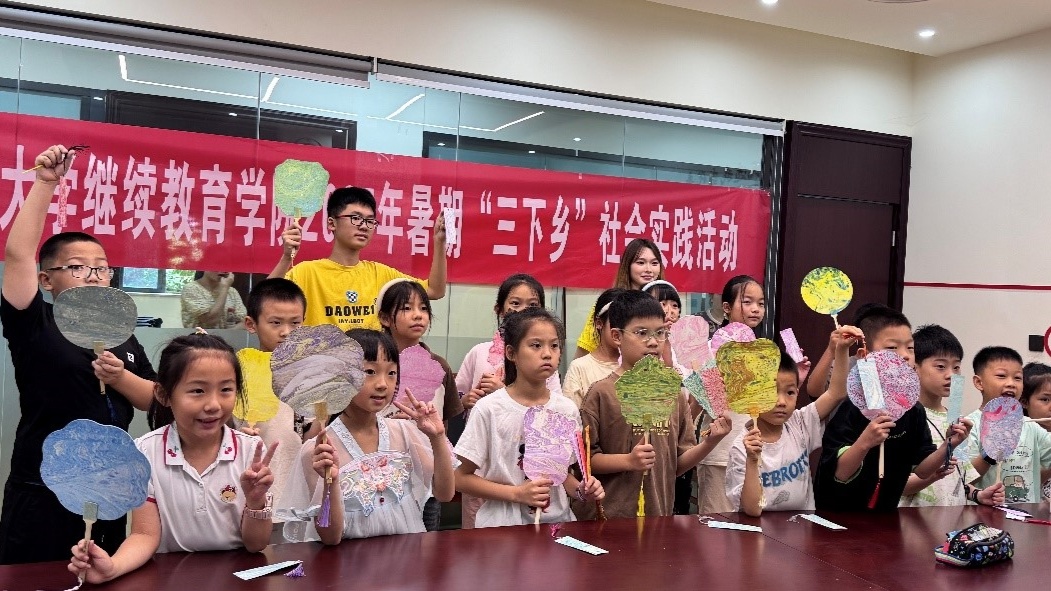 志愿者与小朋友们展示自己制作的漆扇(学校供图)