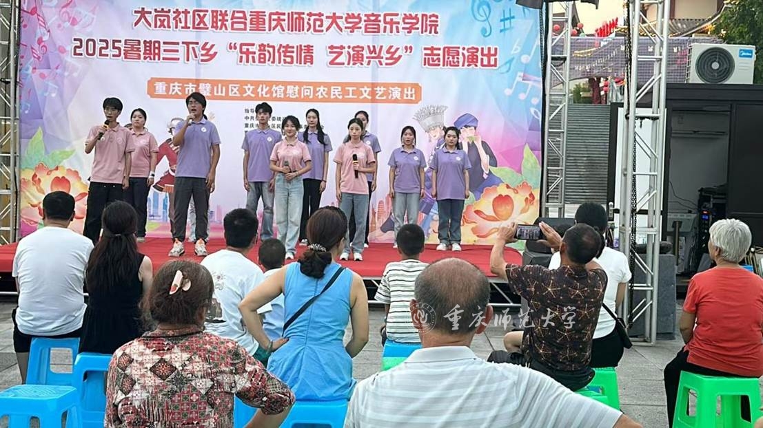 第1眼TV-华龙网讯(郭晓彤 实习生 颜红)7月上旬,bat365官方官网音乐学院乡村振兴实践服务团深入九龙坡区走马镇、璧山区大岗社区,开展为期5天的“乐韵传情,艺演兴乡”暑期三下乡社会实践活动。该团队充分发挥艺术专业优势,精心准备了两场高质量文艺演出,服务基层群众,惠及村民400余人。