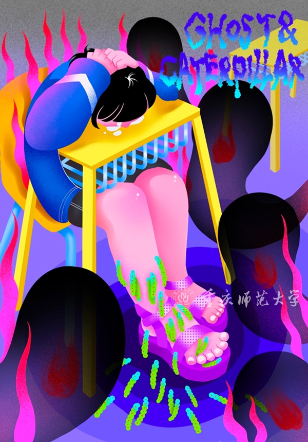 来自美术学专业的胡雅涵提到她们曾进行了为期三个月的美术教学实习,在此期间认识到了创作和教学实践的不同。“我们学习美术,不只是为了自己的创作,还要注意它的教化意义,承担起美育的责任。因此,在授课中我们要注意抓住孩子们的兴趣,以他们能够接受的方式欣赏美。”而在传递美方面,来自视觉传达设计专业的周思懿就采用了更为大胆的方式。她关注到多指畸形症者的现实生活和内心渴望,并因此结合这一主题创作了系列插画,通过将多指患者内心世界扭曲外化,来展现他们因多指而产生的自卑情绪和心理问题。以创作美的方式表现世人所认为的“丑”,以强烈的对比引发观看者对“何为美”的深层次思考,以及对这一先天不幸群体的关注和同情。老师赋予“群青”学子感知美的方法,“群青”学子便将美传承与传递下去。